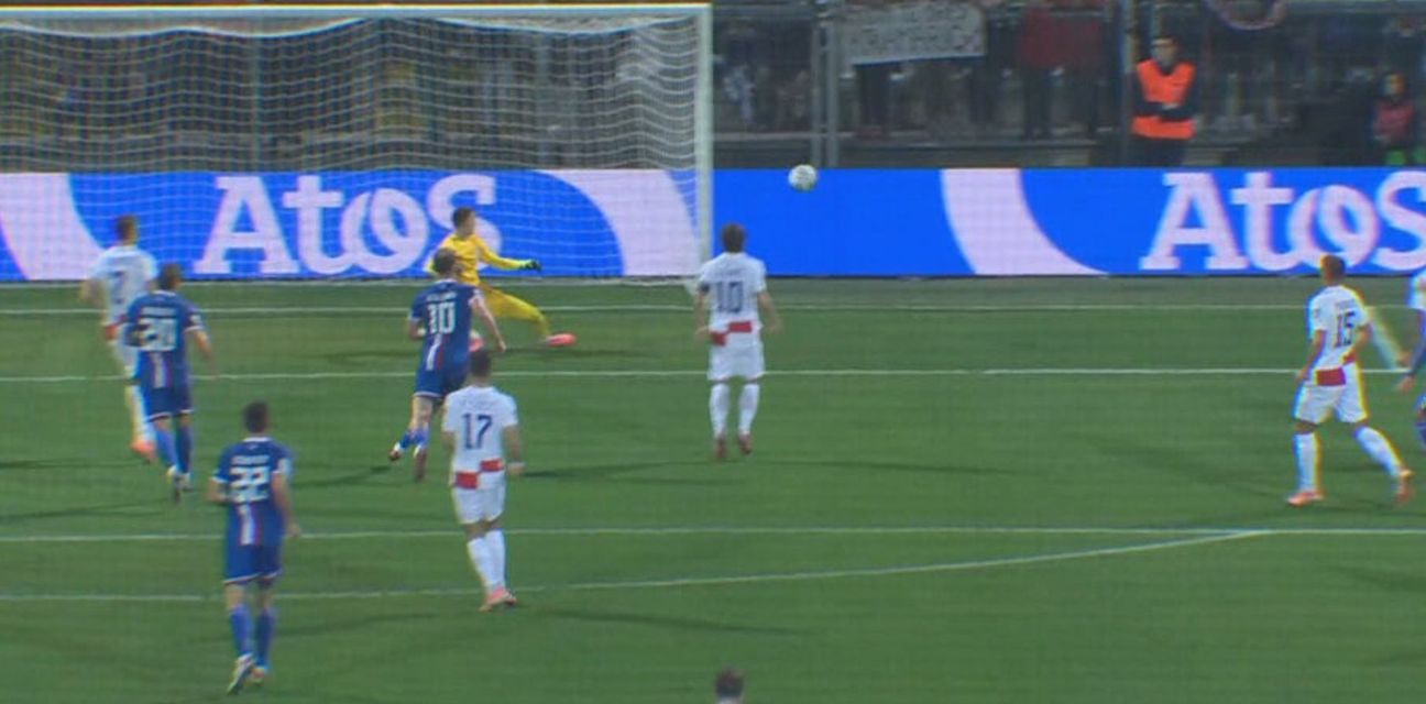 Ofenzivac vrlo organiziranih Farana primijetio je kako ga nitko ne napada pa je odlučio povuči loptu dok god može te je s otprilike 20 metara opalio prema golu.