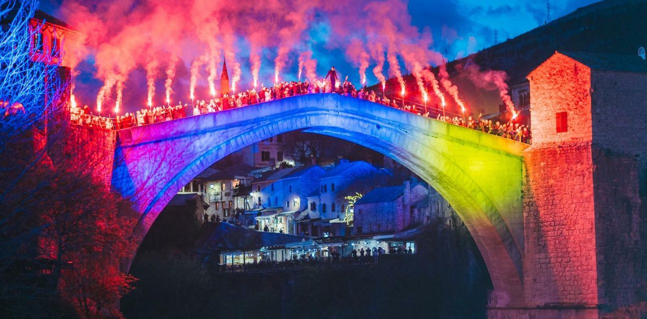 Bosna i Hercegovina izborila je plasman na Svjetsko nogometno prvenstvo, a fešta još uvijek traje. Izborniku Sergeju Barbarezu priređen je veliki doček u rodnom Mostaru, a pao je i skok sa Starog mosta koji je bio u bojama zastave Bosne i Hercegovine, prenosi N1.