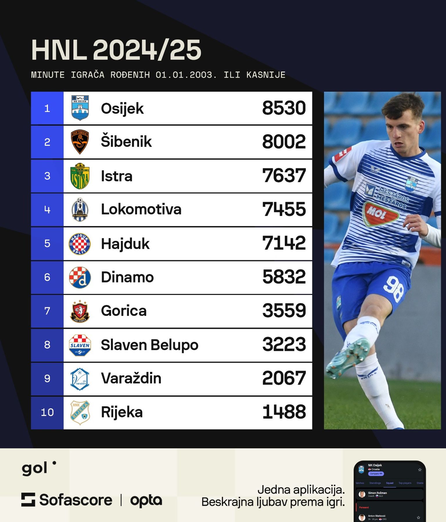 Minutaža mladim igračima u SHNL-u rođenim poslije 1.1.2003. Foto: Sofascore -